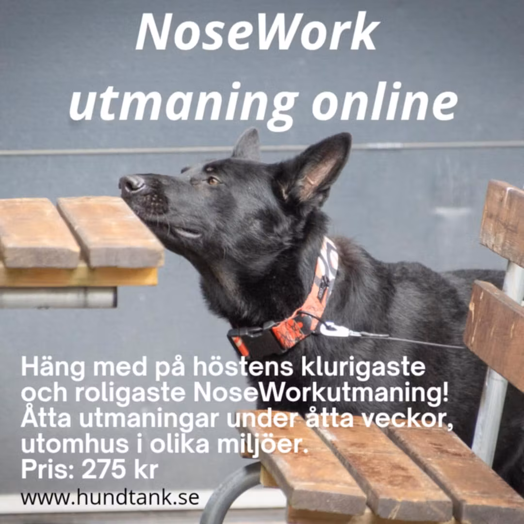 NoseWork utmaning - kluriga sök utomhus! Häng med på höstens klurigaste NoseWork utmaning online, där fokus är att hunden behöver kunna nosa samtidigt som den rör sig i olika miljöer. Utmanande, utvecklande och roligt för både dig och din hund! Du får en ny klurig utmaning varje vecka i åtta veckor. Hunden behöver ha gått en nybörjarkurs eller motsvarande och gärna provat på utomhussök. Du kan anpassa alla utmaningarna efter din och hundens utbildningsnivå. Du filmar och lägger upp alla utmaningar i en sluten facebook grupp. Kort feedback ges på uppladdade sök. Om du lagt upp minst 6 av de 8 utmaningarna innan slutdatumet den 19/10 får du en fin rosett hemskickad Välkommen att anmäla dig till höstens klurigaste och roligaste onlineutmaning! Anne Fahlcrantz, cert NoseWorkinstruktör & aukt doftprovsdomare.